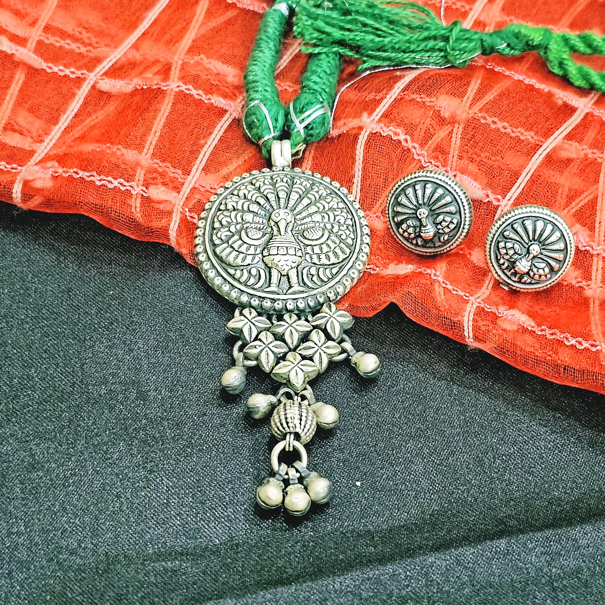 The Peacock Jaal Set features a finely crafted pendant showcasing a graceful peacock motif, enhanced by an intricate jaal pattern at the base complemented with delicate ghungroos. This elegant design is paired with matching stud earrings, creating a harmonious ensemble that captures traditional artistry with refined sophistication. Ideal for elevating any ethnic or festive attire, this set combines detailed craftsmanship with subtle charm for a distinctive, expert-crafted look.